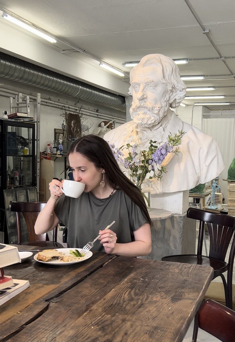 Кофейня-бистро* открылась на Китай-городе внутри скульптурной мастерской Oldich. Выбор блюд небольшой, но приятно, что готовят сами хозяева! Из напитков выбрали любимую классику — капучино на кокосовом (280₽), а из еды — базовые и сытные варианты для завтрака. Сэндвич с пастрами (450₽) порадовал большим количеством индейки и удачным сочетанием с горчично-островатым соусом. Картофельная вафля с творожным сыром и лососем, дополненная кисло-острым соусом (450₽) — идеальный безглютеновый перекус. Пока ждали еду, разговорились с совладельцем бистро Сергеем Щацким и узнали историю места. Раньше они с женой Анной работали в баре ’Маñana’ на Новокузнецкой, а когда им предложили занять часть пространства мастерской на Китай-городе, открыли свой спот здесь. Дизайн проекта придумала Анна: барная стойка из стеклоблоков, яркие вазы с живыми цветами, антикварный комод, бюсты Тургенева и Чехова — очень атмосферно. Фоморейтинг: 7/10. Выпила кофе и понастальгировала по художке. * Meta признана экс