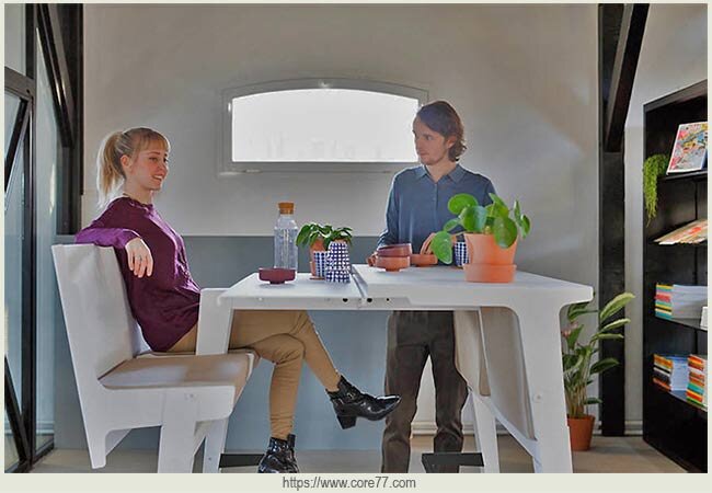 В отличие от традиционного стола, этот уникальный стол-трансформер JoinTable от дизайнера Берта Масселуса можно легко переводить между стоячим и сидячим режимами. Стол-трансформер имеет простой и современный дизайн. Он сделан из прочной нержавеющей стали и алюминия, что придает изделию высокую прочность и возможность эксплуатации в любых условиях. Благодаря своей вариативности данный стол-трансформер подходит для использования как внутри помещений, так и на открытом воздухе, что делает его идеальным выбором для пикников, дружеских посиделок и других неформальных встреч. Стол многофункциональный, скамьи раскладываются на четыре места. В закрытом виде стоячий стол подходит для встречи или спонтанной беседы нескольких человек. Спроектировать складной стол со встроенными сиденьями — непростая задача. По сравнению с обычным столом с отдельными стульями, этот предмет мебели должен решать сразу несколько задач. Он должен не только правильно складываться и раскладываться, но и быть устойчивым