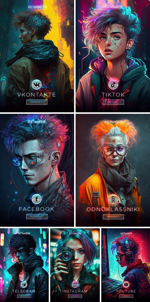 Социальные сети в образе людей глазами нейросети Midjorney. Кстати, вы можете нарисовать такие же картинки, заходи на мастер-класс: https://mauuupav.goodly.pro/gw/room/livewebinar87324 — повторяй и получай результат!