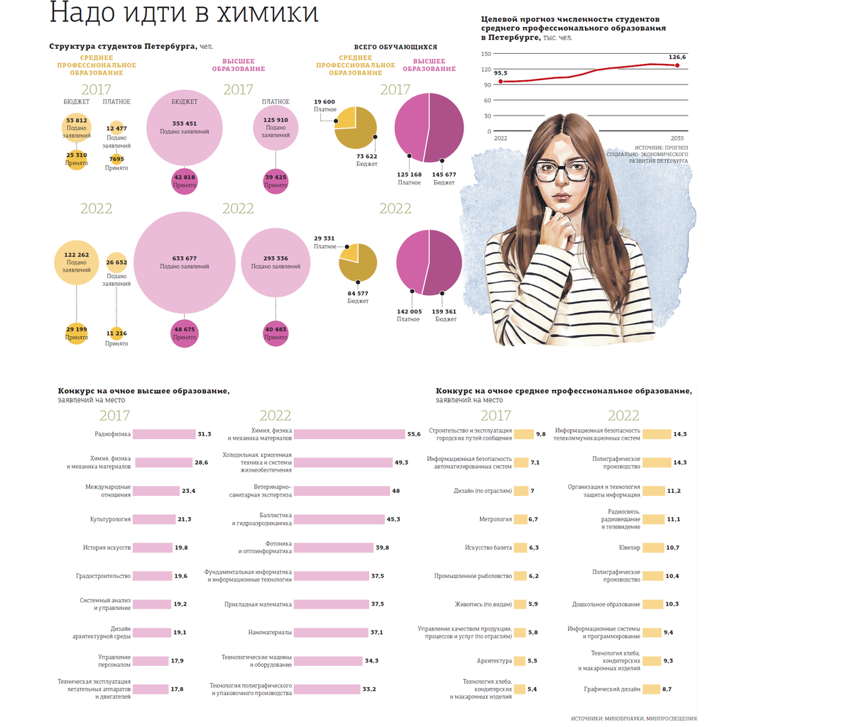 По официальным данным, студентов вузов в Петербурге вдвое больше, чем получающих среднее профессиональное образование (СПО). По данным Минпросвещения РФ, в 2022 году число заявлений на поступление в городские государственные и муниципальные СПО всех форм обучения выросло по сравнению с 2017 годом в 2,3 раза, до 149 тыс. А общее число обучающихся в них выросло на 22%, до 114 тыс. В минувшем году на одно учебное место в них претендовали в среднем 3,7 абитуриента против двух в 2017–м.