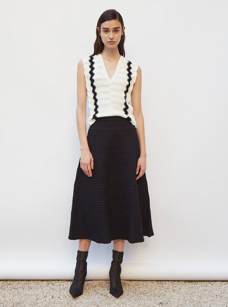 Этот вертикальный волнистый узор, связанный поперек, сам по себе визуально вытягивает образ. Ну, а если к нему добавлена по бокам контрастная полоса темного цвета, то модель к тому же будет стройнить.