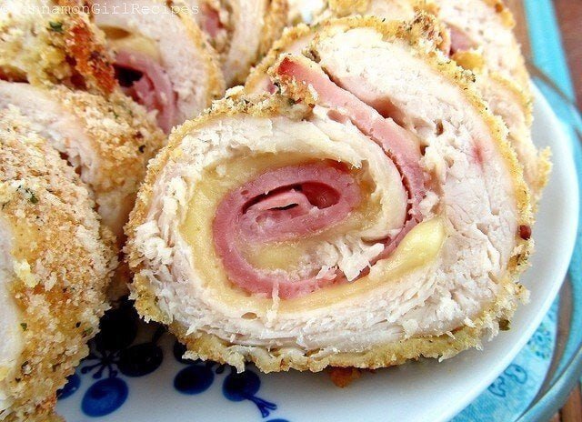 - На каждый отбитый пластик кладут по 2 слайса ветчины, а сверху укладывают ломтики сыра. Затем рулетики аккуратно скручивают и при необходимости фиксируют зубочистками.