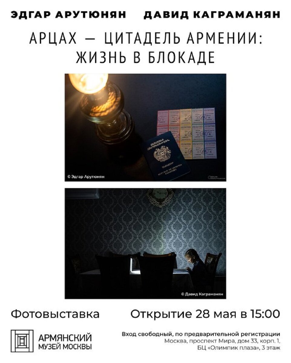 28 мая в Армянском музее Москвы открывается фотовыставка «Арцах — цитадель Армении: жизнь в блокаде». В новой экспозиции будут представлены работы фотографов Эдгара Арутюняна и Давида Каграманяна. Их фотографии — это рассказ о людях, живущих в сложнейших условиях блокады, сейчас, в XXI веке. Со сделанных ими снимков смотрят взрослые и дети, народ Арцаха, не сдающийся в борьбе за своё право на свободу.