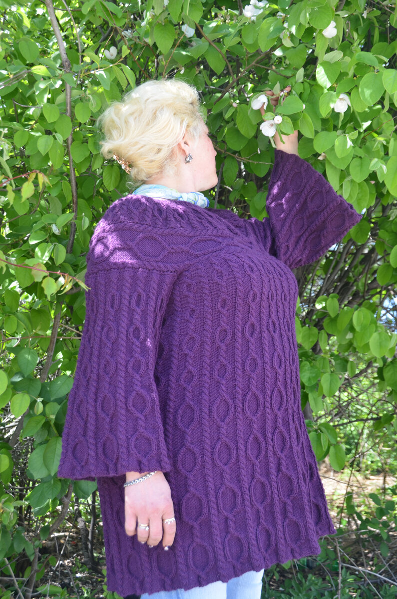 Я уже рассказывала, что у меня было в работе две вещи в технике шамони, и что это вещь на любителя. А сейчас решила показать поближе, тем более, что на улице все цветет и дополнительных декораций не нужно! Я вязала тунику в стиле шамони не традиционным способом (кокетка должна набираться из тела вязания и рукавов), а облегченным, когда кокетка прикетлевывается. Мороки конечно с этой кетлевкой было много, но так как у меня было слишком тяжелое вязания, о принятом решении все равно не жалею. У конструкции вещи есть один существенный минус на мой взгляд, но, возможно, он проявляется только на фигуре полных женщин. При подьеме рук вверх кокетка образует пузырь. Это происходит из-за того что по плечам идет полоса полотна, вязаная поперечно. Тут хорошо видно ту самую полосу. Она является одной из отличительных особенностей шамони. На этом маленький обзор получившейся вещи окончен. Интересно кто-то еще из читателей пробовал связать эту модель?