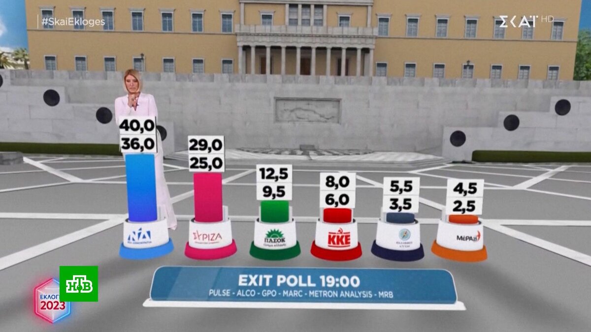 [ Смотреть видео на сайте НТВ ] В Греции идет подсчёт бюллетеней на парламентских выборах. Явка на парламентских выборах в Греции составила чуть больше 60 процентов. Об итогах можно судить по экзитполу, который проводили по заказу местных телеканалов. На данный момент лидирует правящая партия «Народная демократия», во главе которой — действующий премьер Кириакос Мицотакис. Его сторонники собрали около 40% голосов. Второе место — у оппозиционной Коалиции радикальных левых, получившей 20%. В законодательное собрание также проходят социалисты, коммунисты и крайние правые. После выборов парламент должен сформировать правительство. Поскольку ни одна партия не получила абсолютное большинство мест, им нужно вступить в коалицию. Однако «Народная демократия» делать этого не хочет. Из-за этого в стране пройдут повторные выборы. По предварительным данным, их назначат на 25 июня. [ Смотреть видео на сайте НТВ ]