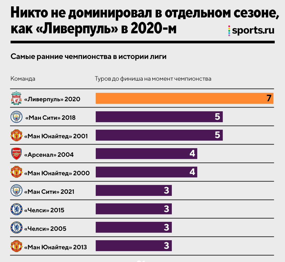 • «Ливерпуль» из-за ковидных сдвигов календарно оформил самое позднее чемпионство в истории – 25 июня. Но по футбольному календарю оно было самым ранним – за 7 туров до финиша. Абсолютный рекорд!