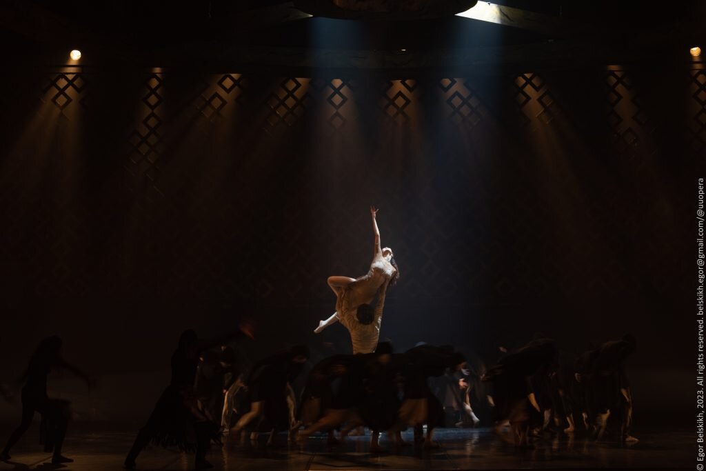 Звуки природы, пентатоники и электроакустики позволяют фантазировать на вселенские темы, позволяя хореографу легко уходить от иллюстративности в метафизический дрейф хореографической природы.