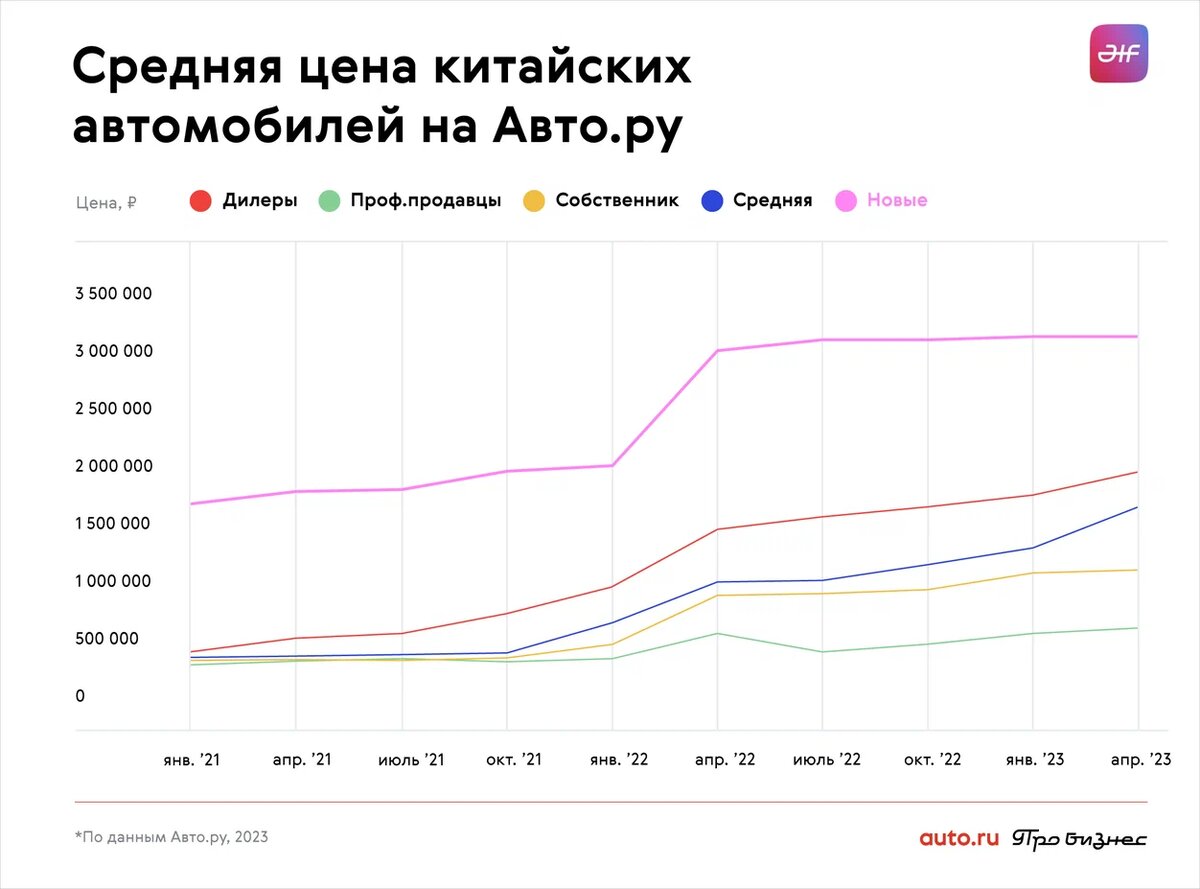 Аналитики посчитали, что с начала 2021 года китайские автомобили на вторичке подорожали в 5 раз! Сейчас их средняя цена на Авто.ру — 1,6 миллиона рублей. По сравнению с началом 2022 года цена выросла на 62%. Эксперты считают, что подорожание связано не столько с ростом цен, сколько с появлением в перепродаже большого количества свежих и дорогих моделей. Например, сейчас средний возраст «китайцев» на вторичке — меньше 6 лет, а пробег — меньше 80 тысяч километров. А в 2021-м в основном продавались 9-летние экземпляры с пробегом больше 110 тысяч. Если смотреть только среди автомобилей не старше 2018 года выпуска, то показатели на одометре в среднем не превышают 35 тысяч. Доля свежих китайских машин (не старше 5 лет) выросла до 58%. Большая часть из них — 74% — почти новые: предложения не старше 2 лет. Источник: Журнал Авто.ру *** С уважением, Ваш независимый автоэксперт Дмитрий Демидов 🚗