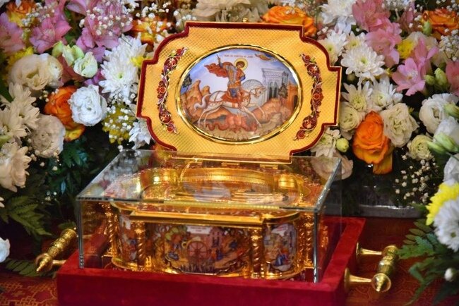 Около полуночи в Оренбург были принесены мощи святого великомученика Георгия Победоносца. Ковчег с мощами небесного покровителя российского воинства по благословению Святейшего Патриарха Московского и всея Руси Кирилла до осени путешествует по епархиям русской православной церкви, чтоб всей страной помолиться за мир на планете. Пребывать в нашем городе они будут только сегодня, 22 мая, до конца дня. К нам ковчег с мощами прибыл из Казани. У памятника оренбургскому казачеству на пересении улиц Чкалова и Степана Разина под покровом ночи святыню встретили митрополит Оренбургский и Саракташский Вениамин с духовенством оренбургской епархии. Делегация с мощами остановилась у сквера имени владыки Леонтия у стелы «Оренбуржцам - героям Первой мировой войны» с мозаичной иконой святого Георгия Победоносца. Крестным ходом ковчег с мощами принесли в Никольский кафедральный собор. Возглавила шествие рота почетного караула. Крестный ход сопровождали военнослужащие, казаки, прихожане и у