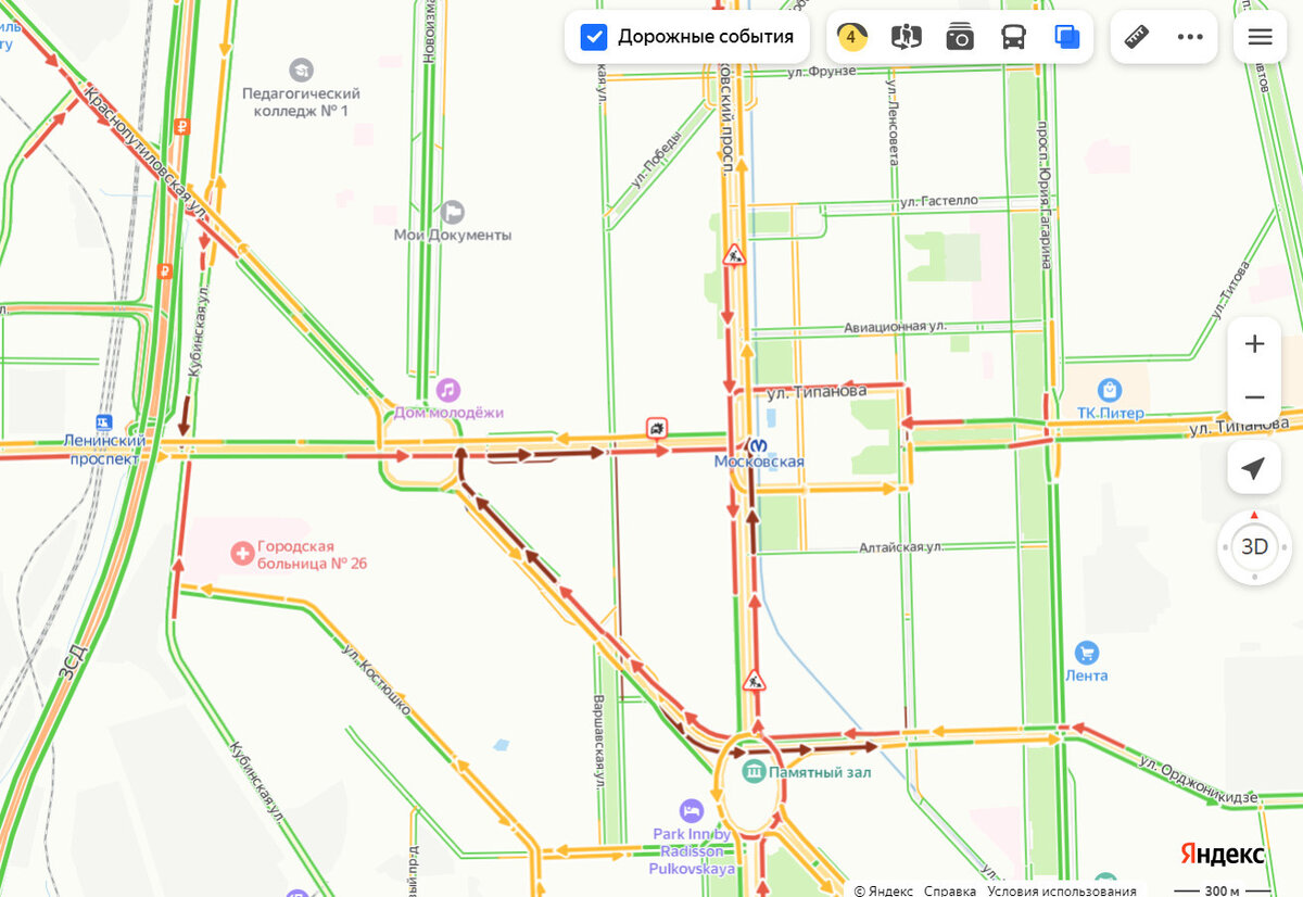 Пробка на Ленинском — 10 баллов. К ремонту добавилась поломка светофоров На юге Петербурга утром 22 мая наблюдается локальный транспортный коллапс. Организатор перевозок сообщает о затруднениях у перекрёстка Ленинского и Московского проспектов. Там к дорожным работам добавилась неисправность светофоров. Общественный транспорт может запаздывать. «Яндекс» в 10:15 зафиксировал на Ленинском «неожиданно плотное движение» — 10 баллов в направлении к Маршала Жукова, что на 5 баллов выше обычного. «В связи с неисправным светофором и дорожными работами на Ленинском пр. у Московского пр. автобусные маршруты №№ 11, 13, 13а, 26, 31, 39, 39Э, 50, 59, 114, 130, 141, 147, 150, 187, 226, 239, 243, 244, 246, 252, 301, 333 и троллейбусные маршруты №№ 27, 29, 35, 45, 47 следуют с задержками до 20 минут», — сообщает Организатор перевозок. При этом «Яндекс.Транспорт» показывает много автобусов и троллейбусов на данном участке. Утром максимальная загруженность дорог Петербурга составила «красные» 7 баллов,