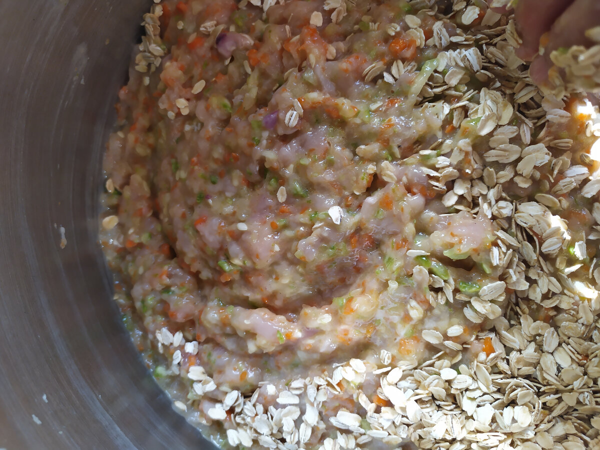 - Плюс овсянка на глаз, чтобы впитать воду из кабачков. Я примерно грамм 200 насыпала.