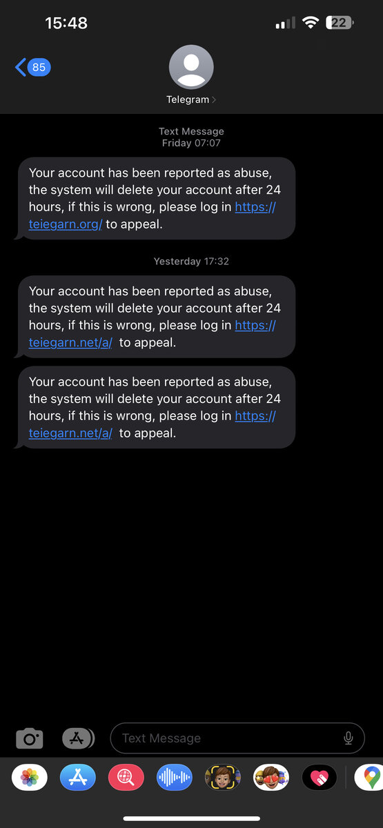 За последние пару месяцев участились случаи воровства Telegram каналов в Таиланде. Об этом предупреждает Королевская полиция на своей страничке в социальных сетях. Под видом устрашающего сообщения о том, что ваш Telegram-аккаунт скомпрометирован, злоумышленники заставляют пользователей посетить ссылки, которые сильно похожи на официальные сервисы Telegram. Если страх перед потерей аккаунта затмит внимание и логику, то вполне себе можно перепутать сайт teiegarn.net с настоящим telegram.org. Друзьям приходят с другими вариантами: Это стандартная фишинговая ссылка, которая приведет вас на сайт, где попросят ввести ваши логин и пароль. После ввода скорее всего ничего не произойдет визуально (может выскочить ошибка или похожая заглушка, что совершенно не важно), но злоумышленники получат на блюдечке ваши сокровенные данные. Личной я получаю такие сообщения уже примерно с апреля и самая первая СМСка действительно меня напугала (на скрине выше я уже почистил). При чем, как вы можете заметить