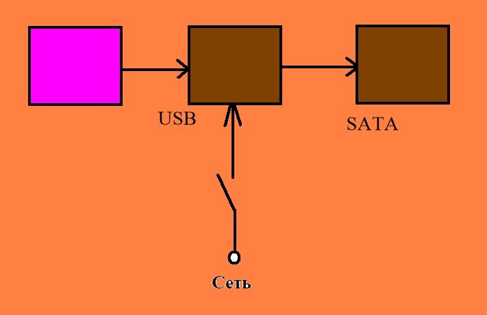 Речь идет о записи информации на дисковод со стандартом SATA, для согласования с которым со стандартом USB был приобретен адаптер с внешним питанием. Это обстоятельство дало положительный эффект при работе с дисководом, поскольку отключение питания дисковода исключает вращения диска во время простоя, с этой целью вилка от адаптера подключена к сети через розетку с выключателем.