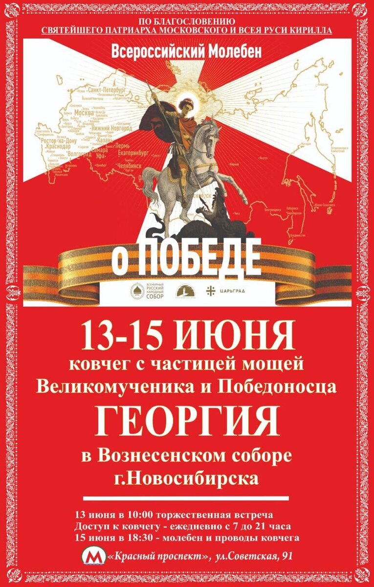 В Новосибирск прибудет ковчег с частичкой мощей Великомученика и Победоносца Георгия По благословению патриарха Московского и всея Руси Кирилла комиссией по развитию паломничества и принесению святынь Русской православной церкви с мая по сентябрь 2023 года во все регионы нашей страны будет принесён ковчег с частицей мощей небесного покровителя Русского воинства Великомученика и Победоносца Георгия. Общенародная акция «Всероссийского молебна о Победе» объединяет 100 городов всех 89 регионов Российской Федерации. В городе Новосибирске святыня будет пребывать с 13 по 15 июня. Ковчег с частицей мощей Великомученика и Победоносца Георгия будет находиться в Вознесенском соборе Новосибирска по адресу: ул. Советская, 91 (метро «Красный проспект»). Во время следования святыни по просторам нашей страны духовенство и миряне Русской православной церкви будут сугубо молиться о военнослужащих Российской армии и всех защитниках Отечества нашего. «Множество православных людей в самых отдалённых регион
