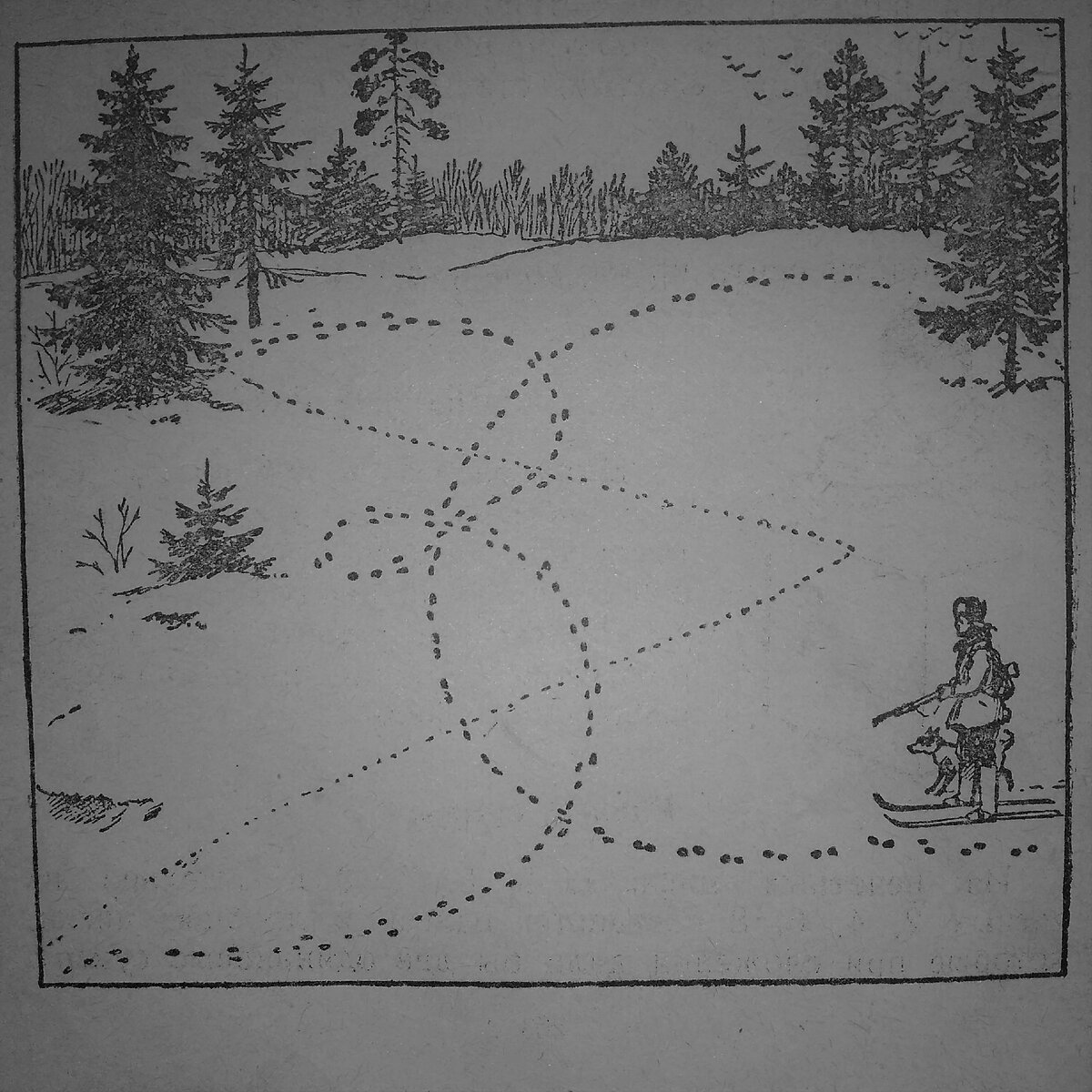 Очередной тест на внимательность из старой советской книжки: На лесную поляну выбежал заяц. Напетлял следы на снегу и скрылся за ёлками. Неподалёку в логове лежала лиса. Учуяла она зайца, бросилась на поляну, пробежала туда-сюда, повела носом по ветру и пустилась вдогонку за зайцем. Часа не прошло - идёт с собакой охотник. Видит следы на снегу - пустил он собаку. Понюхала собака следы, поняла, что звери давно отсюда ушли, прошлась по поляне для виду и вернулась к охотнику. Художник нарисовал здесь ту поляну, на которой побывали заяц, лиса и собака. Вот вы и попробуйте разобраться, где здесь заячьи следы, где лисьи, а где следы собаки. Присмотритесь хорошенько к рисунку - и вы быстренько решите эту задачу. В дополнение предлагаю ещё пару задач: Одного человека спросили: -Сколько вам лет? -Порядочно, - ответил он. - Я старше некоторых своих родственников в шестьсот раз. Может ли это быть? Назовите два числа, у которых количество цифр равно количеству букв, составляющих название каждого