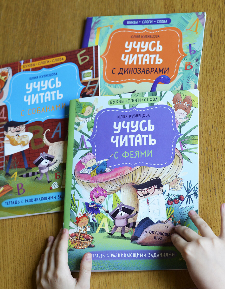 Моей дочке скоро в школу. Она не ходила на подготовительные занятия, мы ограничились детским садом и домашней подготовкой. Тетради, по которым мы занимаемся дома, очень разные. Но есть одна серия, которая вызывает у дочки восторг и много-много энтузиазма заниматься по ним! Это тетради с развивающими заданиями издательства МИФ и Юлии Кузнецовой. Сейчас в серии «Учусь читать» 4 тетради: «Учусь читать с кошками», «Учусь читать с динозаврами», «Учусь читать с собаками» и самая последняя – «Учусь читать с феями». Это самая любимая серия у моей дочки. Для меня основной критерий: когда ребенку интересно, она хочет заниматься сама. Не я бегаю за ней с фразой «ну давай же», а она ходит за взрослыми и просит прочитать задание или проверить ее. С серией «учусь читать» дочка проявляет инициативу, все делает сама, а меня и мужа просит либо прочитать задание, если ей не понятно, либо уже проверить сделанное. Принцип и структура всех тетрадей одинаковый: формат 19,5*25,5 см, 48 страниц, полностью цв