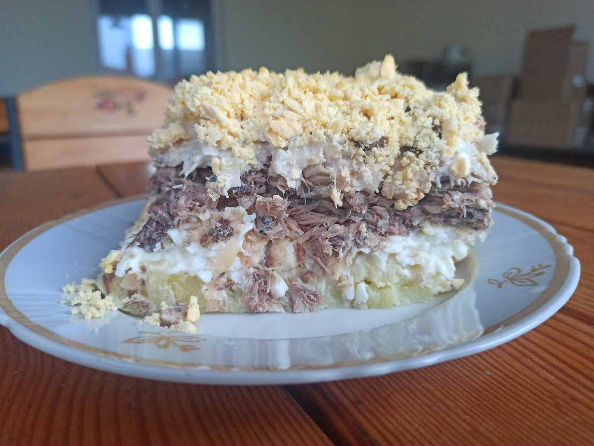 Салат "Мимоза" с рыбными консервами, сыром и картошкой