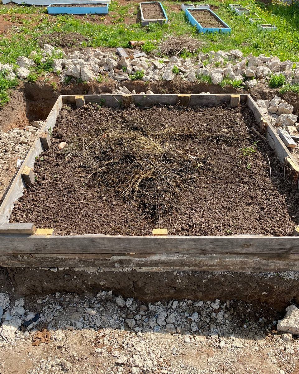 16-го числа мы сделали теплую грядку для огурцов и кабачков, говорят, они такое любят. В нашем случае под грядку мы использовали короб высотой в две доски, тот, что специально оставили от недо-бани. Нижний слой - достали из компостера - это недопревшая прошлогодняя солома. Накрыли ее картоном, а сверху насыпали слой плодородной земли. Пролили каждый слой водой. В процессе Оксана пыталась пятой точкой пригладить горы битого бетона, что пока окаймляют нашу грядку, но пики не стали полянами. Удовольствия никакого, кроме морального, и памятные переливы из синего в желтый на ягодицах 🤣