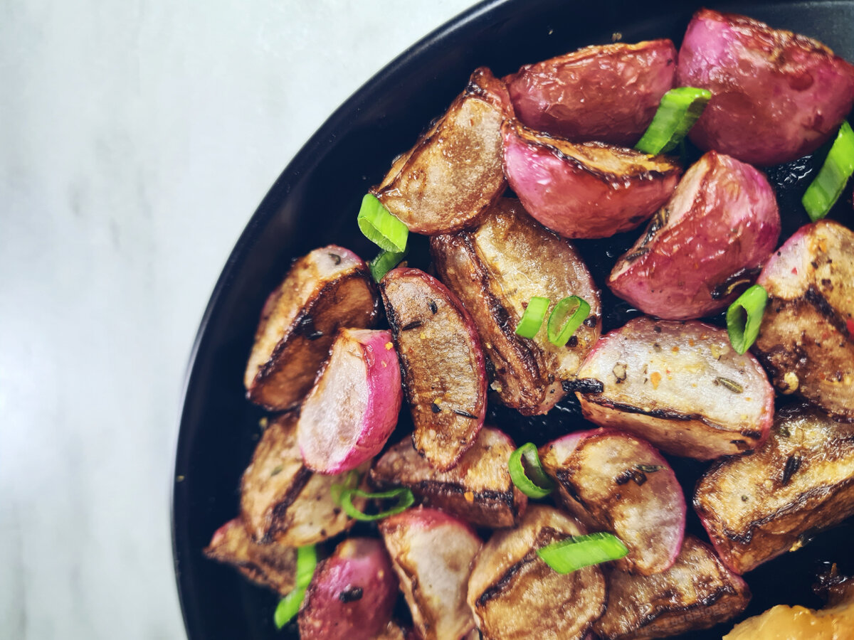 Здравствуйте! Рада видеть вас на канале Tipa_FoodBloger и сегодня я хочу поделиться с вами рецептом очень интересного овощного гарнира. Жареная редиска - блюдо необычное, ведь обычно редис кушают свежим и не подвергают его термической обработке. Но вкус у жареной редиски интересный и мало похож на вкус свежего корнеплода. При обжаривании из редиски уходит острота, вкус становится сладковатым и нежным, а сам корнеплод становится мягким. Если пробовали жареную редиску поделитесь своими впечатлениями в комментариях: На что, по вашему мнению, похож вкус? 👩🍳 На этот способ приготовления я наткнулась случайно и из любопытства решила приготовить. Готовится быстро, просто и вкус меня очень удивил! В статье вы найдёте пошаговый рецепт приготовления жареной редиски. Будет необычно! Итак, приступим...) Ингредиенты: Пошаговое приготовление: 1. Редис промываем, обрабатываем и разрезаем на 4 части 2. Чеснок нарезаем пластинами 3. В скороде разогреваем масло и обжариваем чеснок до золотистого цвет