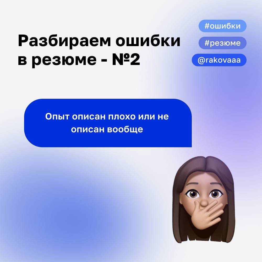 Вторая ошибка (одна из самых критичных) - некорректно описанный опыт или его отсутствие. Как избежать ошибки Описывайте опыт достаточно кратко, но емко, не жертвуя смыслом ради сокращения объема. Что делать, если опыта нет, разберем в следующих постах. Структура описания опыта стандартна: опыт = обязанности + результаты работы. В первом блоке описываем, что делали (процессы), какие инструменты использовали. Второй блок про то, что в результате получилось, желательно показать на цифрах. Пример формулировки результата: «С нуля реализовал проект по внедрению системы Х, что позволило сократить издержки на 40%». Если нет возможности привести количественный результат, качественный тоже подойдет 👌🏼 Итого - из блока про опыт должно быть понятно, что и как вы делали изо дня в день (процессная часть) и каких результатов удалось достичь. Как правильно расставить акценты В общем случае акцент делаем на самый новый и релевантный опыт работы. Совсем старый опыт можно смело убирать, ос