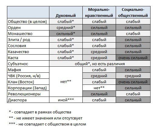 Большая часть привычных институтов и структур (партии, движения, корпорации и др.) различаются в правилах, принципах и законах исключительно на государственно-общественном и личностном уровнях. В таблице представлены структуры и общности, отличающиеся на верхних уровнях, для каждой указан сводный параметр устойчивости, силы идентичности и единства. Приведены верхние три уровня: духовный, морально-нравственный и социально общественный.