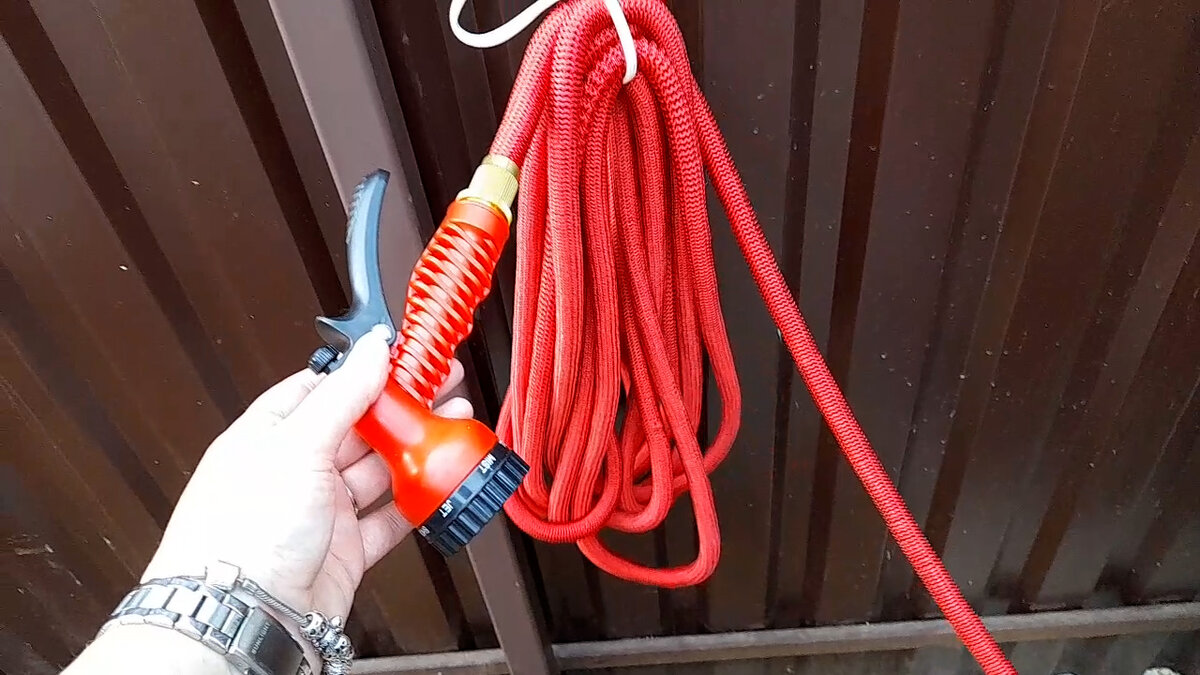 Цветники и огород мы поливаем шлангом. У нас обычный шланг, который при помощи хомута соединен с погружным насосом. Шланг довольно длинный 20 метров. Справиться с ним сама я не могу. Он постоянно перекручивается, заламывается. При поливе страдают растения, попадающие под шланг. К растягивающимся шлангам я присматриваюсь давно, но мне они казались ненадежными. Долго сомневалась, будет ли он растягиваться от нашего напора воды. Как оказалось насос, которым мы качаем воду из бочки, очень слабый. Дождеватель, который я купила в прошлом году, насос не потянул. Но, увидев, такой шланг на ВБ, решила рискнуть и заказала. Купила шланг длиной 10 м и растягиваться он должен был на 50 м. Мои опасения подтвердились, шланг практически не растянулся. Как был 10 м, так и остался. Его конечно можно растянуть принудительно, но это уже не то. Муж сделал соединение с насосом. Колхозно, но работает. Распылитель, который идет в комплекте, работает хорошо. Подобные распылители мы покупали в ФП. Из нескольких