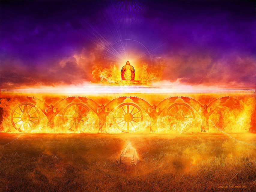 “И было в шестом году, в шестом месяце, в пятый день месяца: сидел я в доме моём, и старейшины иудейские сидели пред лицом моим, и низошла на меня там рука Господа Бога. И увидел я: и вот подобие мужа, как бы огненное, и от чресл его и ниже — огонь, и от чресл его и выше — как бы сияние, как бы свет пламени. И простёр Он как бы руку, и взял меня за волосы головы моей, и поднял меня дух между землёй и небом, и принёс меня в видениях Божиих в Иерусалим, ко входу внутренних ворот, обращённых к северу, где поставлен был идол ревности, возбуждающий ревнование. И вот, там была слава Бога Израилева, подобная той, какую я видел на поле” (Иез. 8:1-4).