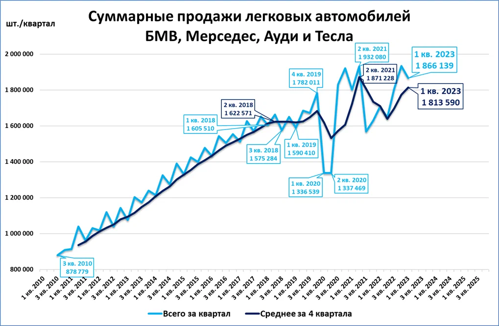 Такой подтекст содержится в статье финансового аналитика Сергея Блинова. Очень уважаемого мною, если что. Читаем не заголовок, а резюме: Продажи премиум-автомобилей сейчас не сигнализируют о каких-либо проблемах. Напомним, что во время кризиса 2008 года продажи премиум автомобилей начали падать ещё в конце 2007 года, то есть более чем за полгода до краха "Леман Бразерс". И в общем-то пруф в виде график это красноречиво подтверждает: Но, как всегда, предлагаю посмотреть на эту ситуацию по-другому (шире и глубже). Прежде всего давайте посмотрим на Теслу. За последние 4 месяца 2022 года было продано 655 тыс. автомобилей этой марки. А за 4 месяца этого года - 669 тыс. Т.е. эта разница - "статистическая погрешность", и можно говорить, что Тесла с учетом конкуренции от китайских производителей (BYD уже обогнал по суммарным продажам гибридов и электромобилей) летит в направлении, название которого начинается на букву Ж. Ведь после введения диких скидок до 20% - кроссовер Model Y сейчас продае