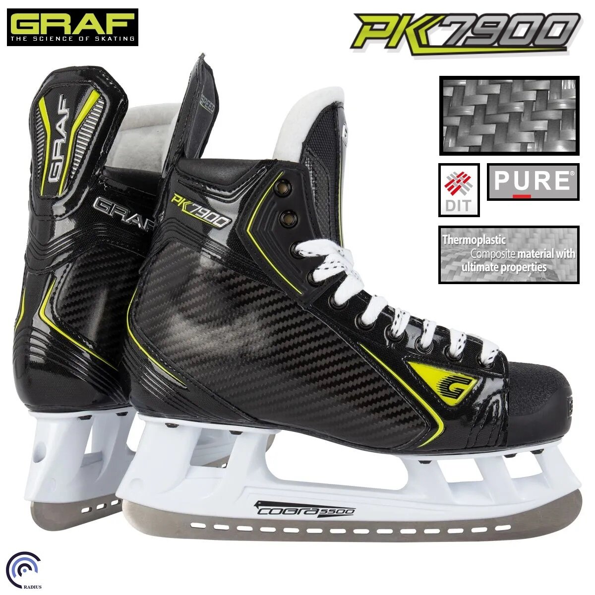 PK7900 отличается превосходными характеристиками, комфортом и защитой, в которых нуждаются самые амбициозные профессиональные игроки. PK7900 состоит из более чем 70 отдельных деталей, изготовленных из тщательно отобранных или разработанных материалов. Асимметричная конструкция верха включает в себя больше материала на внутренней стороне ботинка, именно там, где большая часть усилия от ноги передается в конек. Для PK7900 GRAF использует легкие и чрезвычайно твердые композитные материалы.