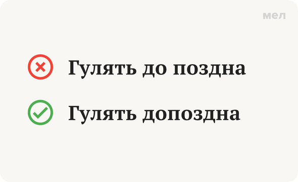 Дети, у которых в этом году нет экзаменов, уже могут попробовать отпроситься у родителей гулять до позднего вечера. Но для этого нужно как минимум грамотно сформулировать запрос. Иначе вместо прогулки вам светит повторение параграфа по русскому. Правильно: допоздна Ура, у нас в рубрике опять наречие. И, как и все наречия, на первый взгляд оно какое-то непонятное. Вроде бы есть же выражение «гулять до вечера». И по аналогии с ним раздельное написание тут прямо-таки напрашивается. Но стоп. В словосочетании «до вечера» мы видим предлог «до» и существительное «вечер». И если следовать этой логике, то окей: «до» — это предлог, а что такое «поздна»? Это форма какого существительного и в каком падеже? Затрудняетесь с ответом? Вот и мы тоже. Слова «поздна» в русском языке и правда не существует. Зато есть слово «поздний». Наречие «допоздна» образовано как раз от него при помощи приставочно-суффиксального способа. А по правилам русской орфографии такие наречия пишутся слитно: добела, досыта, до