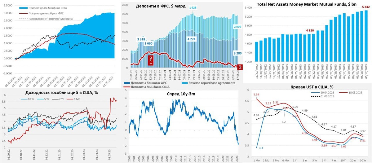 Йеллен тратит ... $250 млрд с начала месяца ФРС на неделе возобновила сокращение портфеля ценных бумаг сразу на $29.9 млрд, помимо этого прочие активы сократились на $14.4 млрд, в сумме же активы ФРС сократились на достаточно внушительные $46 млрд. Но Минфин США исправил ситуацию умудрившись потратить со своих счетов в ФРС сразу $86.5 млрд за неделю. Йеллен без остановок, в итоге на счетах в ФРС у Минфина США осталось всего $68.3 млрд, с начала месяца с них было потрачено $248 млрд. Бюджетные доходы на 17 мая сильно отстают от прошлогодних (-21%), а расходы опережают прошлогодние на 37%. Если так продолжится – Йеллен действительно может успеть «обнулиться» и к 1 июня, т.к. текущие возможности не превышают $150-170 млрд. Долларов в системе стало больше: остатки на счетах банков в ФРС выросли на $54.7 млрд. Обратные РЕПО c ФРС сократились на $19.6, хотя фонды денежного рынка получили снова приток ($13.6 млрд). Кривая госдолга инвертирована – месячные бумаги дают доходность 5.59%, Мин