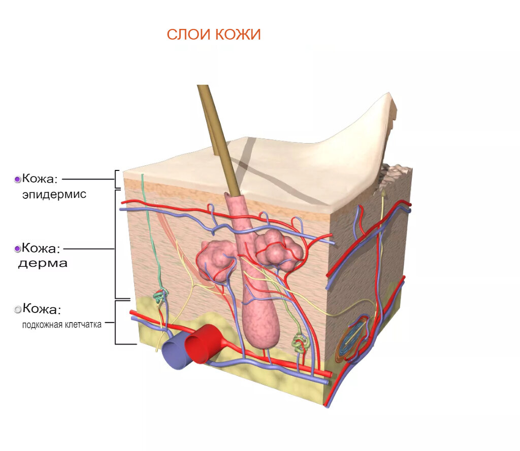 Эпидермис и дерма лежат на гиподерме, также известной как подкожный слой. Он состоит из соединительной ткани, содержащей жир, кровеносные сосуды и нервы. Он действует как защитная подушка и термоизоляция, тем самым регулируя стабилизируя тела.
