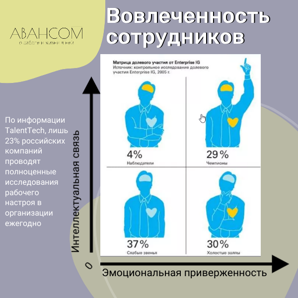 Учтем, что исследование проводилось не в России. В нашей стране даже четверть организаций не анализирует и не работает с таким термином как "вовлеченность"
