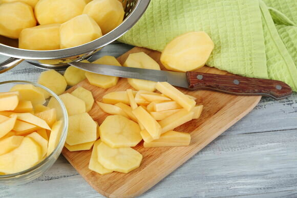 Для знаменитого французского блюда — картофельного гратена — клубни нарезают кружочками. Для этого возьмите острый нож и нарежьте картофель на пластинки нужной толщины. Чтобы кружочки получились одинаковыми, нож важно держать строго перпендикулярно доске, не опуская кончик.