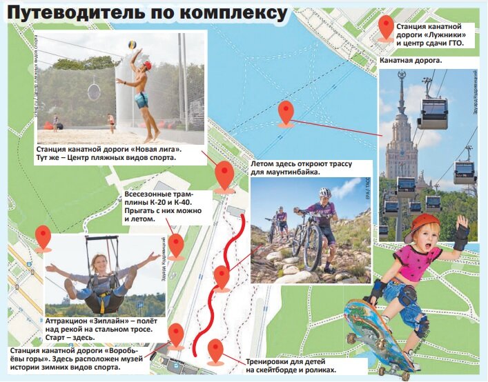 Новенький горнолыжный комплекс в центре города – прекрасное место для семейной прогулки в любой сезон. Здесь можно заниматься спортом, посетить выставки, прокатиться на канатной дороге и пролететь над рекой на экстремальном аттракционе «Зиплайн». «Трамплины К-40 и К-20 у нас всесезонные. Все желающие могут побывать на бесплатных занятиях по прыжкам с трамплина и лыжному двоеборью. Летом специальное покрытие имитирует скольжение по снегу, а зимой склоны оснежают», – рассказала нам директор по развитию спортивно-туристического комплекса «Воробьёвы горы» Марьяна Компан. Малышей от 3 лет летом на Воробьёвых горах научат кататься на роликах и скейтборде. Первое занятие бесплатное. С 15 мая у станции канатной дороги «Новая лига» открылся Центр пляжных видов спорта. Здесь можно сразиться в флагбол, регби, пляжный волейбол. А скоро заработает и трасса для маунтинбайка. А ещё на канатной дороге можно сыграть свадьбу. Выбрать дату регистрации можно на портале mos.ru в рамках проекта «Новые адрес