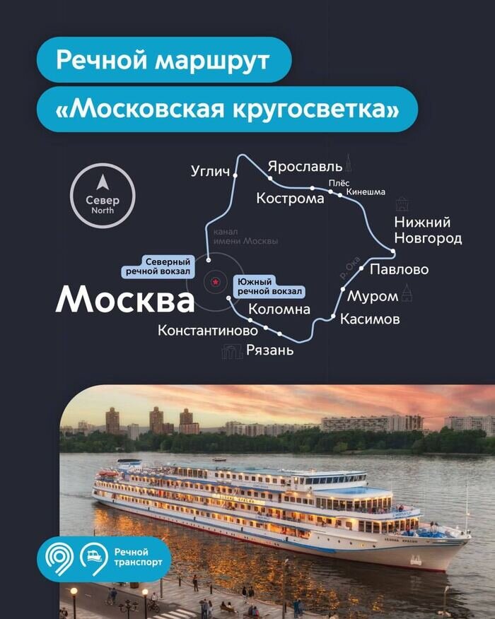 Теплоходы стартуют от Северного речного вокзала. За неделю круиза они проходят через несколько городов Золотого кольца. Во время речного путешествия пассажиры посещают более 10 крупных туристических центров: Углич, Ярославль, Кострому, Плес, Нижний Новгород, Муром, Рязань и другие. Завершается маршрут на Южном речном вокзале. Купить билеты в Московскую кругосветку можно на сайтах туроператоров и в кассах Северного и Южного речных вокзалов. История маршрута. История этого маршрута началась еще в 1938 году. Тогда впервые Северный и Южный речной вокзалы были соединены прогулочным маршрутом — между ними курсировал теплоход «Иосиф Сталин». Время в пути составляло 4 часа. В 1959 году впервые ввели кольцевой маршрут, который соединил Москву и Нижний Новгород. Он проходил около 1900 км по территориям Московской, Тверской, Ярославской, Костромской, Ивановской, Нижегородской, Владимирской и Рязанской областей. Такое путешествие начиналось на СРВ и длилось 10 дней. Проходя по каналу им. Москвы, в