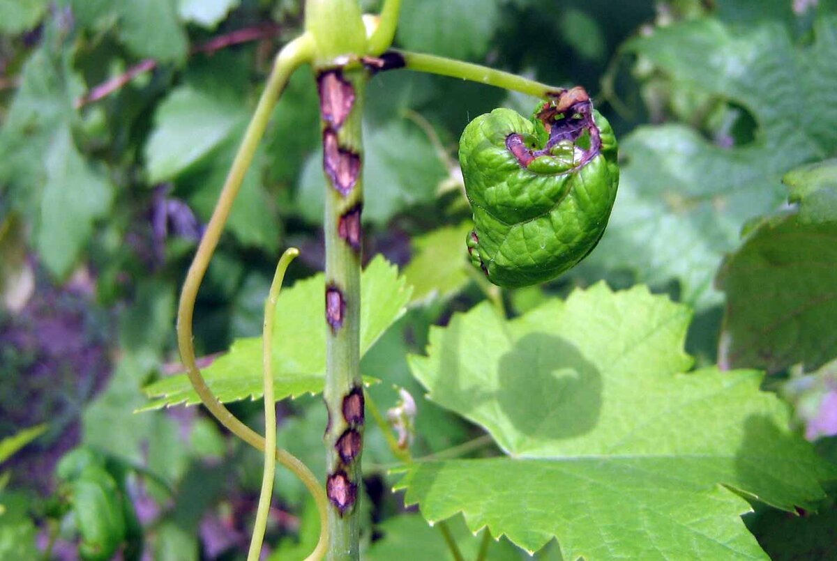 Листья винограда становятся желтыми и только вдоль жилок сохраняются зеленые участки, листовая пластина деформируется, а ее края подсыхают — это виноградная оспа или антракноз. Антракноз винограда развивается в холодную и дождливую погоду, а сухая и жаркая погода сдерживает развитие болезни. Эффективно справится с этой проблемой бордоская жидкость 1%, Купролюкс, Ордан.