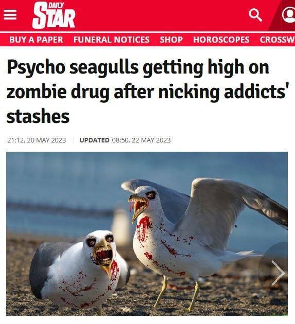 Британские чайки отбирают у прохожих не только еду: представители зарубежных СМИ говорят о том, что птицы нападают на наркоманов и выхватывают у них запрещённые вещества, после употребления которых ведут себя агрессивно; местные жители прозвали таких чаек «зомби». Об этом 23 мая стало известно из сообщений ежедневной газеты-таблоида «Daily Star». В Британии местных жителей массово атакуют чайки. И если ранее птицы отбирали у прохожих еду, то теперь у британских чаек появилось новое «лакомство»: они выхватывают у уличных наркоманов запрещённые вещества, чтобы употребить их в пищу. После того, как птицы «полакомятся» наркотиками, они начинают вести себя агрессивно. Местные жители и журналисты за это прозвали их «зомби-чайками». Почему птицы воруют и употребляют в пищу запрещённые вещества, пока остаётся неизвестным. Ранее «Утренний Юг» информировал о том, что осенью 2022-ого года в российских городах с наступлением холодов стали появляться пьяные птицы. Снегири наедались забродивших ягод