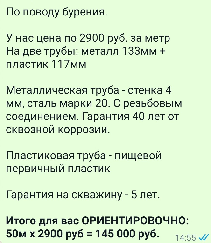 Ни для кого не секрет, что вода на даче просто неоходима. Однако учитывая повышение цен, сделать воду на даче, стало очень дорогим удовольствием. К тому, чтобы сделать скважину на участке, я шла много лет, никак не удавалось скопить нужную сумму. В идеале хотелось по старинке - выкопать колодец. Но как оказалось, в нашем районе колодцы пересыхают. Учитывая опыт соседей принимаю решение делать скважину. Анализирую отзывы, общаюсь с компаниями, которые занимаются бурением скважин. В реальности, рынок переполнен теми, кто предлагает подобные услуги, но часть из них пришлось исключить по разным причинам. Кто-то мог не отвечать на элементарные вопросы, у некоторых были достаточно размытые границы цен, многие ставят только металлические трубы без пластика внутри. Единственный кто отправил мне внятную смету это был менеджер компании Своя Вода. Ниже прилагаю расчёт, кстати за пределы суммы не вышли. В этом плюс. Но на этом плюсы закончились))). Итак, под такое событие беру на работе неоплач