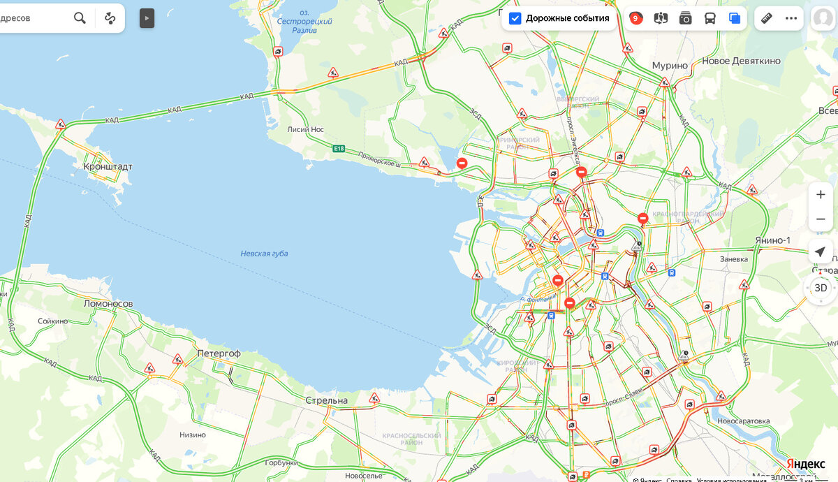 Ремонты и час пик окрасили КАД крупные магистрали в бордовый цвет. В Петербурге — 9 баллов Дороги Петербурга в вечерний час пик 23 мая встали в 9-балльных пробках. Для вторника это на 2 балла больше обычного. Плотнее всего — на набережных и КАД. На юге Петербурга участок кольцевой автодороги между Московским шоссе и Октябрьской набережной замер в пробках в обе стороны. Движение там затрудняют дорожные работы и, по данным пользователей «Яндекс.Пробок», массовое ДТП с «перевертышем». Затор на внешнем кольце уже около 17 часов тянулся на 9,2 километра. А на севере КАД собралась самая длинная пробка недели для шести часов вечера — 9,6 километра от Горского шоссе до Приморского шоссе, сообщает аналитический центр «Яндекс.Пробки». Традиционно стоит движение на проспекте Славы, Невском путепроводе, Ивановской улице, Володарском мосту и Народной улице. Затор там тянется порядка 5 километров. Плотно на Софийской улице от КАД в сторону центра. Пулковское шоссе встало в город, а Московский проспе