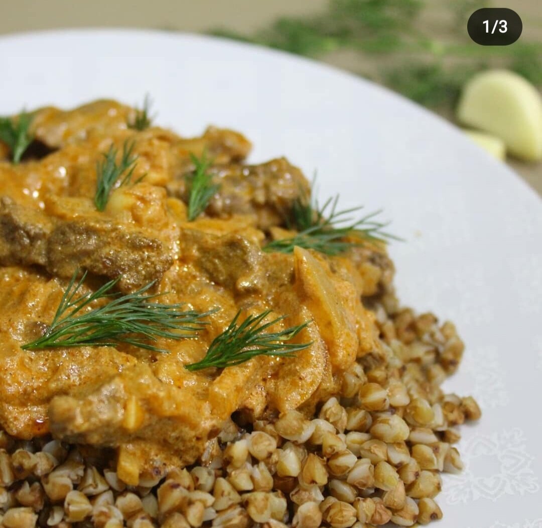 Говядину порезать на небольшие равные куски, обжарить на раскаленной сковороде для того, чтобы запечатать сок внутри мяса. Жарить до готовности не нужно. 1-2 минуты - не более. Мясо выкладываем в чашку и далее режем полукольцами лук и поджариваем до золотистого цвета. После мясо пересылаем обратно в сковороду, добавляем 4 ложки сметаны, ложку томатной пасты и заливаем горячей водой из чайника (около 100 грамм). Солим, перчим по вкусу, добавляем выдавленный чеснок. Рекомендую добавить щепотку копчёной паприки. Всё тщательно перемешиваем и даём потомиться минут 5-10 под крышкой.