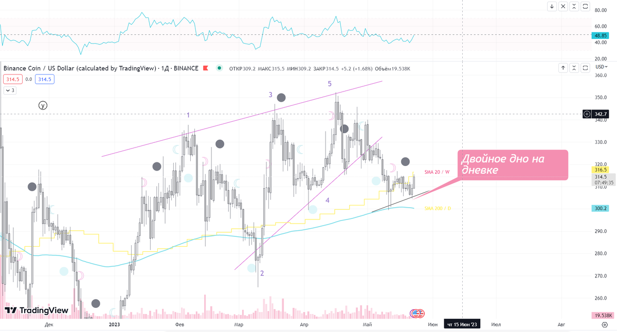 На BNB нарисовалась разворотная формация в виде двойного дна прямо на 200-от дневном мувинге . В новолуние падения мы не увидели , но мы также знаем что астроциклы отрабатывают с садержкой. RSI разгруженв медиану. Фигура образовалась в волне 4 , и скорее всего является очередной манипуляцией для сбора стопов шортистов , поэтому советую при входе не переборщить с плечами , а лучше и вовсе торговать без них:)