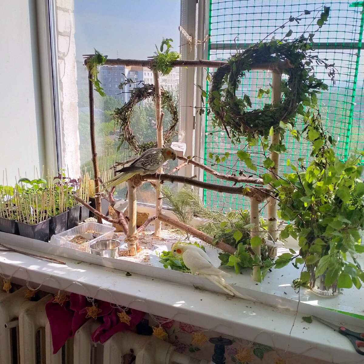 Щас много рассказывать буду! Вроде бы я съездила в деревню к маме на один день, а сколько всего произошло. 1-е, я помогла ей поставить деревенский душ, в этот раз сосед одолжил шуруповёрт и душ почти не шатается. Вместо бачка - старый умывальник с краником. Самое то, чтобы ополоснуться после огорода. Для кого-то не понятно чем тут гордиться, а я очень радуюсь, что хоть что-то сделала для мамы. Скучаю по ней... Из-за птиц нуждающихся в постоянных обследованиях и ежедневной дачи лекарств я не выездная. Без няньки для птиц это невозможно сделать. 2-е, мы с мамой ходили вдоль реки и резали ветки для птиц. Комары и мошки сильно раздражали, но с пустыми руками к папугам я не поеду. Поэтому мы собрали материалы для нового стенда и всякого разнотравья для птичьей еды. Все одуванчики и полынь сегодня они доели. На холме отколола большой кусок глины. Рядом увидела много отверстий в глиняном отвесе, которые сделали птички. Папуги были рады зелени, а вот глину предпочти кушать уральскую жёлтую