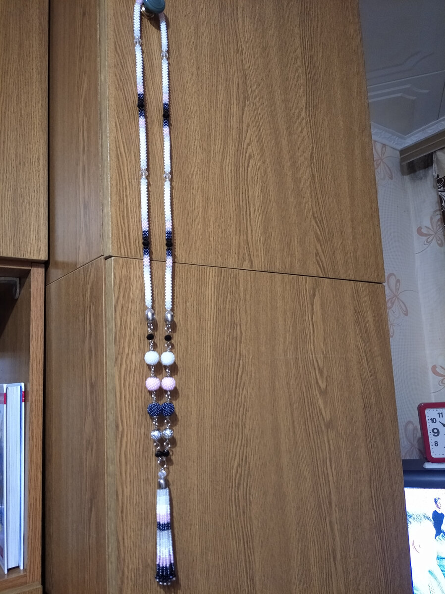 Привет всем, кто заглянул ко мне на канал! Этот сотуар я изготовила по просьбе очень милой женщины по имени Эльвира. Она попросила сделать это украшение к своему новому платью. Её желание было - чтобы присутствовали такие цвета. Придерживаясь этого, в конечном итоге получился вот такой сотуар. Связан он на основе квадратного жгута с вставками стеклянных бусин (ронделей). Цепочка с бусинами, обвязанными вручную, вулканическая лава (под серебро) плюс рондели. Получилось неплохо. Я сама осталась довольна. Хотя это не первый сотуар, сделанный мной, он намного лучше. Это подарок Эльвире ко дню рождения. Я назвала бы его "Нежность".