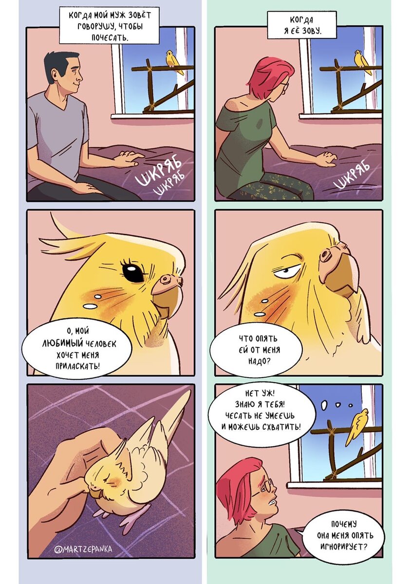 Разве у вас такого не бывало? Питомцы любят не всех людей в доме, а кого-то конкретного человека. У нас в семье это мой муж. Говоруша готова с ним спать, давать себя чесать, сидеть часами у него на плече. Просто потому что он не представляет опасности. А я злодейка, которая вечно ловит руками и пичкает лекарствами. Чтобы она себя разрешила почесать, надо добиваться уговорами и действовать как стратег.