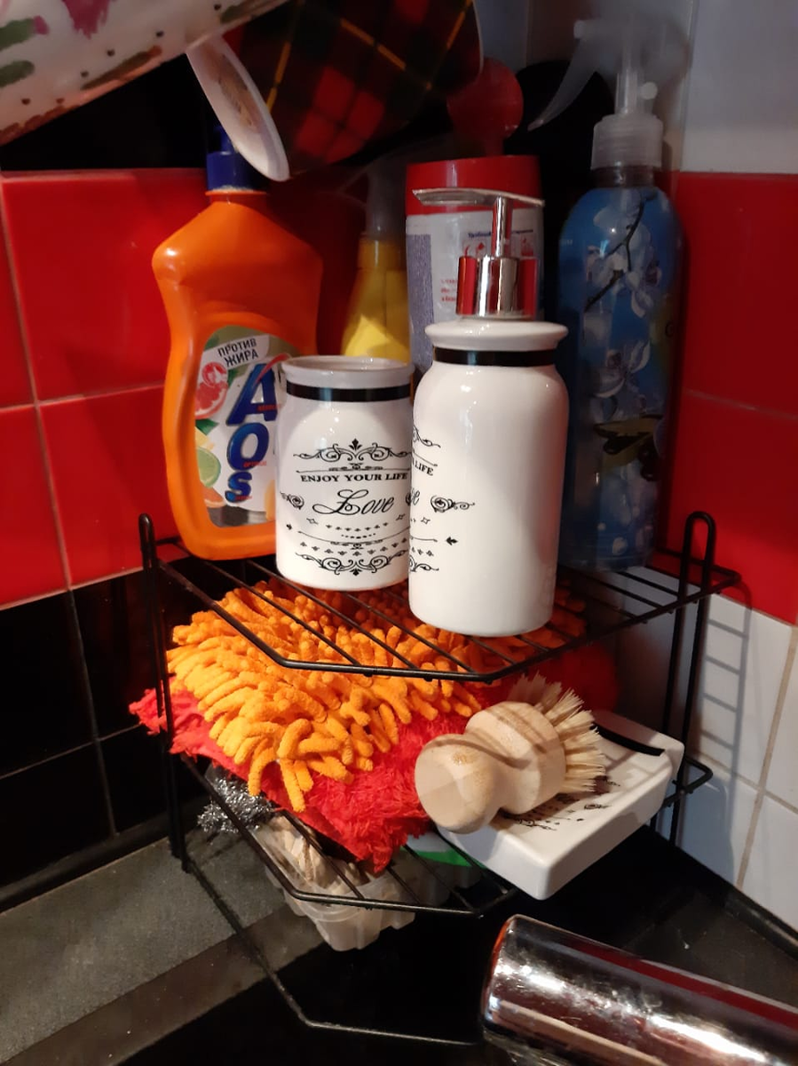 Здравствуйте, дорогие друзья. Вот уже пару лет как в Фикс-прайсе продаются элементы кухонной коллекции Лофт. Сначала была коллекция черного цвета, затем - белого. Ну а сейчас черный и белый Лофт продается одновременно. Свою коллекцию Лофт я начала собирать как раз два года назад. Первым появился лимонадник на металлической подставке. Ну а дальше пошло - поехало. Черная коллекция у меня в городской квартире. Белая - в загородном доме. И для меня эти вещи незаменимые помощники в быту. Уверена, что для многих из вас - тоже. Вот сегодня я и решила поговорить об этом. Я покажу, как я применяю часть коллекции в в своем доме. Но надеюсь, что и вы в долгу не останетесь и поделитесь своими идеями и фото. Начну с квартиры. Не так давно в Фиксе продавалась угловая полка. Насколько помню, она была навесная. Но я ее вешать не стала. Она отлично встала у мойки. Фото вышло немного странным. В верхней части фото кружки висят на крючках под шкафчиком с посудой. . Зимой продавались полочки - подстав