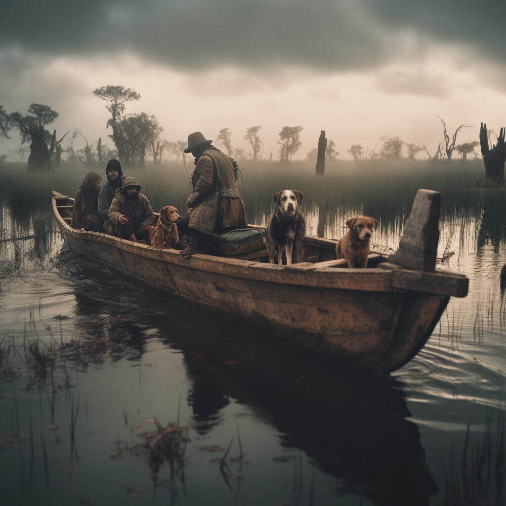 ⏳17:23 Мы наконец то отчалили от берега и направились навстречу приключениям. Мы знаем, что путь предстоит неблизкий, но морально мы настроены только на успех. Никто из нас определенно не знает с чего конкретно начать наши поиски, однако у каждого из нас есть свои собственные гипотезы и предположения... Я, как сторонник научного подхода, планирую отыскать следы инородного объекта, который определенно должен иметь какой-то двигатель для полета. Биоз полагается на свои обряды и что голоса покажут нам путь. А кто-то просто готов прочесать каждый миллиметр болота, либо надеется на чудо. Как бы то ни было, дорога у нас одна - только вперед. Лодка раскачивалась из стороны в сторону, все молчали и лишь собаки сложив морды на борт изредка тихо поскуливали, глядя куда-то в пустоту. На улице стояла приятная весенняя погода, но солнца видно не было. Небо было затянуто облаками и, казалось, будто мы вышли на прогулку, а вовсе не на поиски непонятных летающих