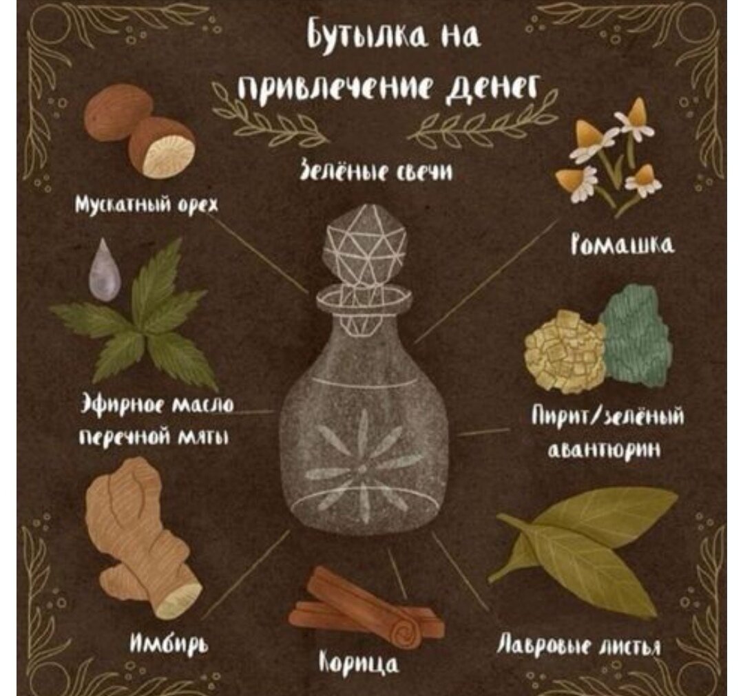 Делюсь с вами рецептами тех ритуалов, которые вы могли бы самостоятельно реализовать у себя дома. Рецепт ВЕДЬМИНОЙ БУТЫЛКИ НА ПРИВЛЕЧЕНИЕ ДЕНЕГ. 🕸️ Ингредиенты, которые на картинке должны храниться в новой бутылке. Бутылка должна быть ранее не использованная при хранении продуктов или каких-то вещей. 🕸️Чтобы бутылка работала, наполнять ее необходимо в час полной луны. 🕸️Уберите бутылку подальше от глаз, но, чтобы можно было при необходимости легко дотянуться. В кладовке или в захламленное место ставить не нужно. 🕸️ Всё имеет срок годности, ритуал, спустя некоторое время, придётся повторить.