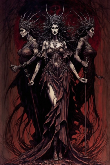 Геката — лиминальная богиня, соединяющая небесное и хтоническое царства. Как «Королева ночи», она может заглянуть в прошлое, настоящее и будущее, и к ней часто обращаются за защитой, руководством и мудростью. Она родилась от Персеса и Астерии , которые благословили ее властью над небесами, землей и морями. Она помогла Деметре в поисках Персефоны, предоставив ей ночью два пылающих факела. Затем Геката стала спутницей Персефоны в Гайдесе.
