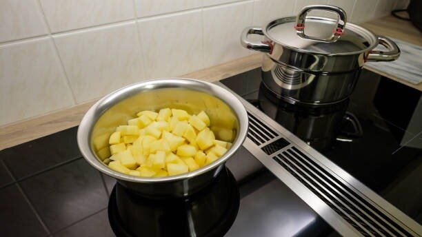 Накройте кастрюлю крышкой и готовьте при 100% уровне мощности СВЧ в течение 8-10 минут или до тех пор, пока картофель не станет мягким.